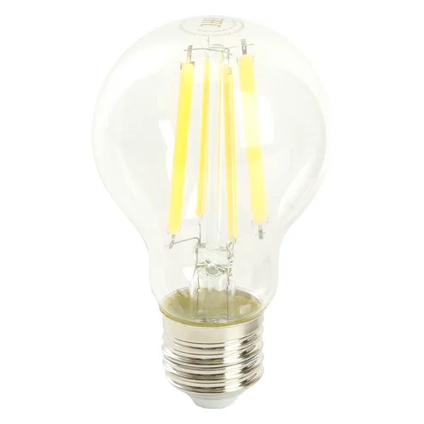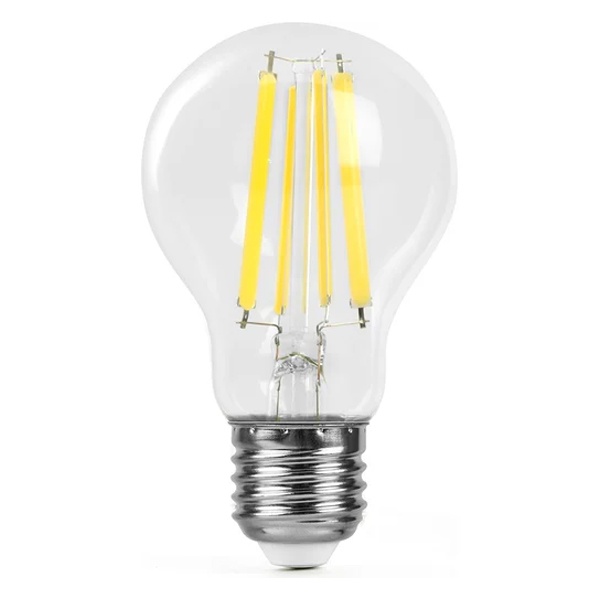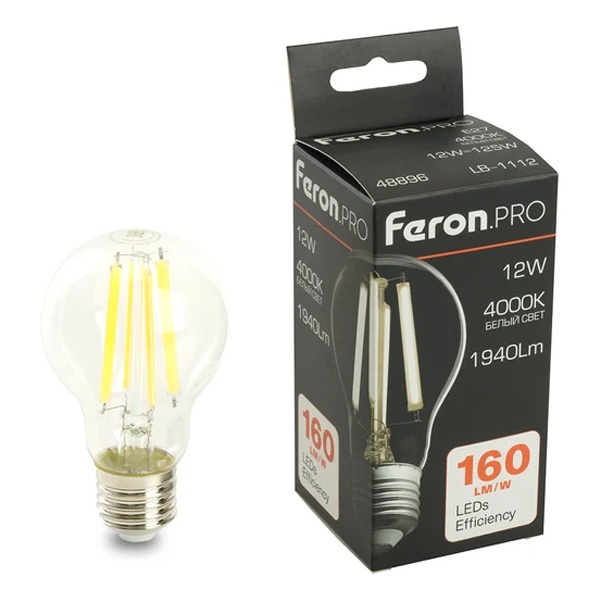 Филаментная лампочка Ферон с нитевидными светодиодами, мощностью 12 Ватт, с цоколем E27, нейтральный белый свет, прозрачная колба 48896