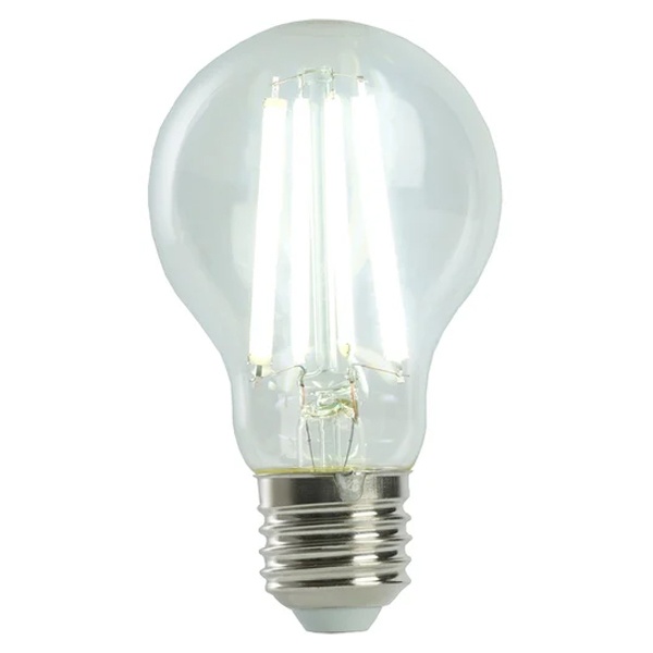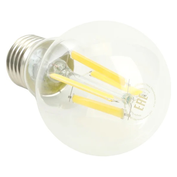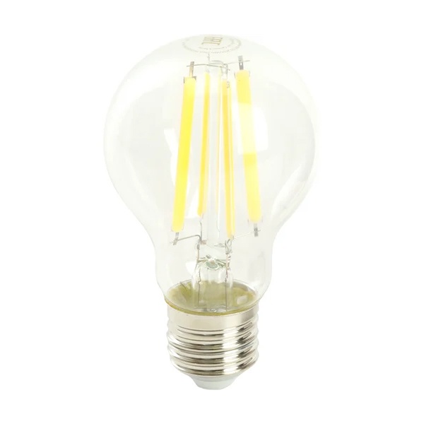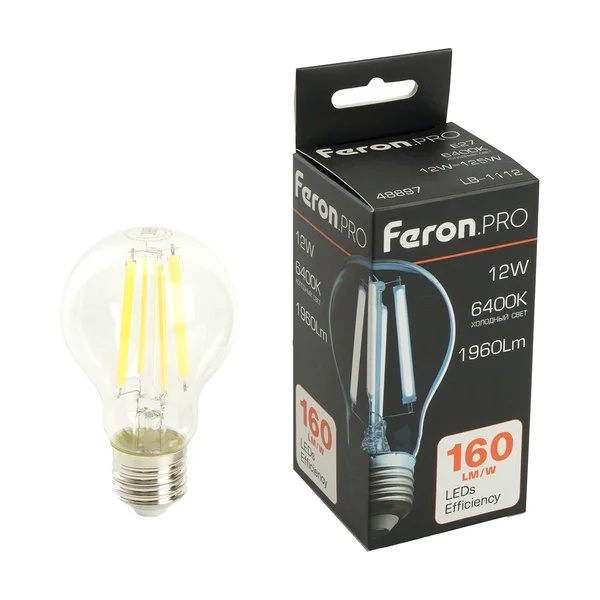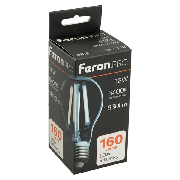 Филаментная лампочка Ферон с нитевидными светодиодами, мощностью 12 Ватт, с цоколем E27, холодный дневной свет, прозрачная колба 48897
