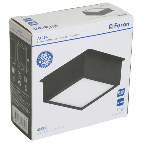 • Светильник светодиодный Feron AL254 12W 4000K 960Lm 110° черный, грильято 89x89 мм с драйвером