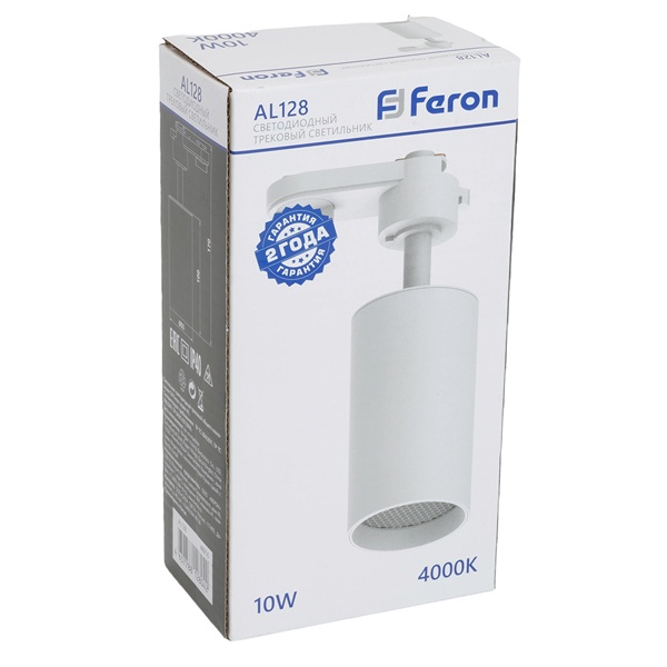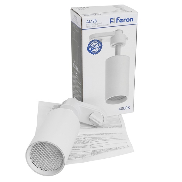 Белый трековый однофазный светодиодный светильник AL128 Ферон с антибликовой сеткой, мощность 10Вт, нейтральный белый свет с углом рассеивания 35 градусов 48916 Удобная система регулировки направления светового потока позволяет максимально точно настроить освещение под ваши задачи: светильник вращается на 360° по горизонтали и наклоняется до 90° по вертикали, обеспечивая гибкость в создании световых акцентов.