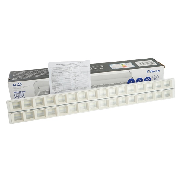 Белый трековый однофазный светодиодный светильник AL123 Ферон, мощность 2*30Вт, нейтральный белый свет с углом рассеивания 60 градусов 48925 Трековые однофазные светильники предназначены для эффективного и равномерного освещения торговых пространств, включая магазины, шоурумы и выставочные залы. Благодаря продуманной конструкции они могут устанавливаться вплотную друг к другу, формируя непрерывные световые линии без разрывов, что обеспечивает современный и аккуратный внешний вид освещения.