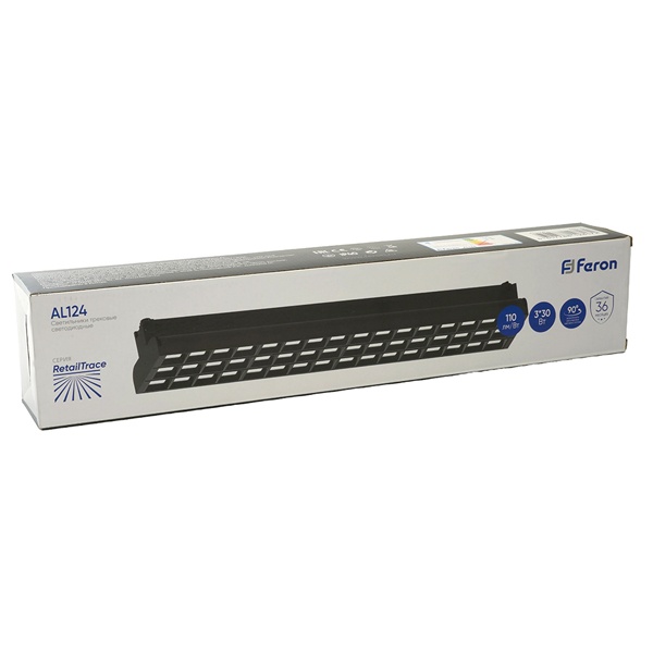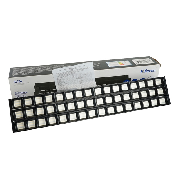 Черный трековый однофазный светодиодный светильник AL124 Ферон, мощность 3*30Вт, нейтральный белый свет с углом рассеивания 60 градусов 48930 Трековые однофазные светильники предназначены для эффективного и равномерного освещения торговых пространств, включая магазины, шоурумы и выставочные залы. Благодаря продуманной конструкции они могут устанавливаться вплотную друг к другу, формируя непрерывные световые линии без разрывов, что обеспечивает современный и аккуратный внешний вид освещения.