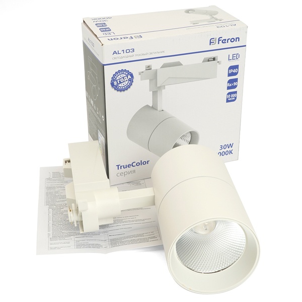 Белый трековый однофазный светодиодный светильник AL103 Ферон, мощность 30Вт, нейтральный белый свет с углом рассеивания 35 градусов 48941 Удобство регулировки направления светового потока делает этот светильник универсальным инструментом для создания идеальной атмосферы: он свободно вращается на 360° по горизонтали и наклоняется до 90° по вертикали, позволяя точно направить свет туда, где он действительно нужен - будь то рабочая зона, декоративный элемент или картина на стене.