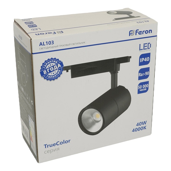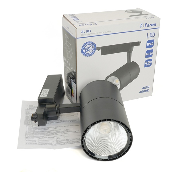 Черный трековый однофазный светодиодный светильник AL103 Ферон, мощность 40Вт, нейтральный белый свет с углом рассеивания 35 градусов 48944 Удобство регулировки направления светового потока делает этот светильник универсальным инструментом для создания идеальной атмосферы: он свободно вращается на 360° по горизонтали и наклоняется до 90° по вертикали, позволяя точно направить свет туда, где он действительно нужен - будь то рабочая зона, декоративный элемент или картина на стене.