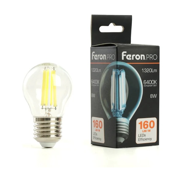 • Лампа светодиодная филаментная шарик Feron.PRO LB-1708 G45 8W 6400K 175-265V E27 1320Lm дневной свет