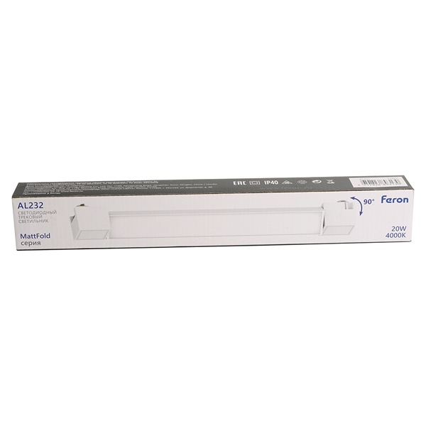 Трековый светодиодный светильник Feron AL232 представляет собой линейный светильник, предназначенный для установки в трековую систему освещения. Он оснащён матовым рассеивателем, который обеспечивает равномерное распределение света и формирует широкий световой поток с углом рассеивания 120°, снижая эффект ослепления.