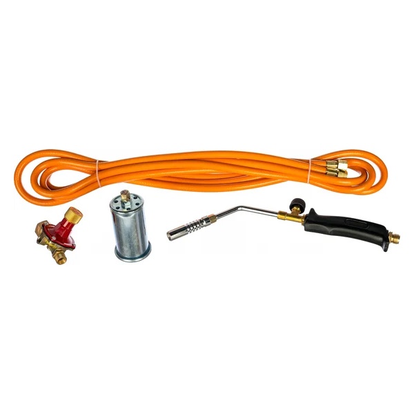 широкая насадка для термоусадки с диаметром сопла 50 мм, обеспечивающая равномерный прогрев больших поверхностей; узкая насадка для пайки с диаметром сопла 17 мм, позволяющая точно и аккуратно работать с мелкими деталями; редуктор для стабильной подачи газа и безопасной эксплуатации;шланг высокого давления длиной 5 метров, обеспечивающий свободу перемещения и удобство работы на расстоянии от баллона.