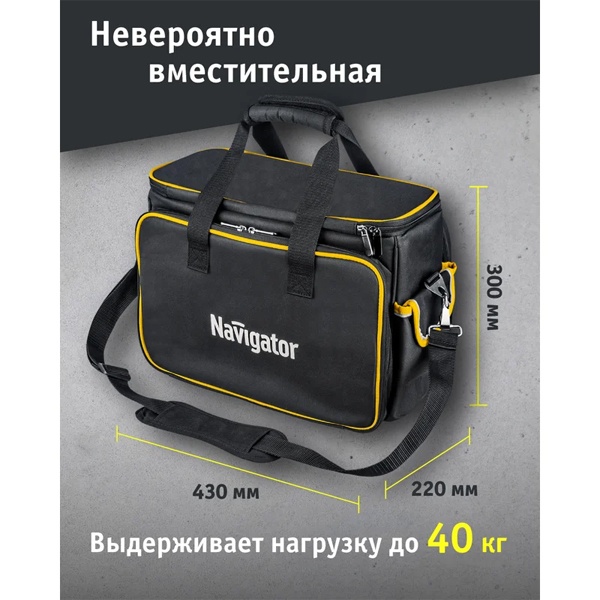 Сумка-портфель монтажника Navigator NTA-Bag06 предназначена для удобной переноски и хранения инструмента, электроизмерительных приборов, монтажных аксессуаров и средств индивидуальной защиты.