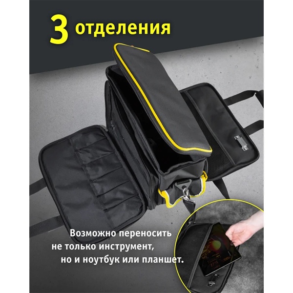 Портфельная конструкция прямоугольной формы включает одно большое и два малых отделения, что позволяет размещать не только инструмент и комплектующие, но и документы, планшеты или ноутбуки.