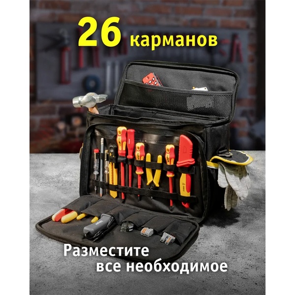 Внутренние и внешние карманы помогают аккуратно организовать все необходимые инструменты и аксессуары. Откидные боковые отделения и двойные замки обеспечивают быстрый и удобный доступ к содержимому в процессе работы.