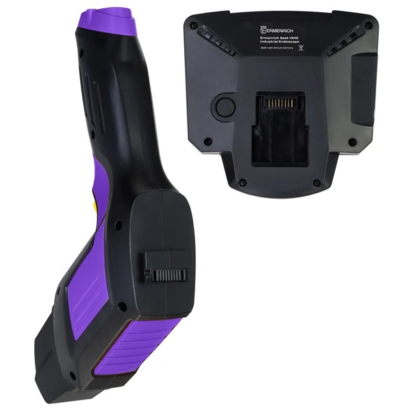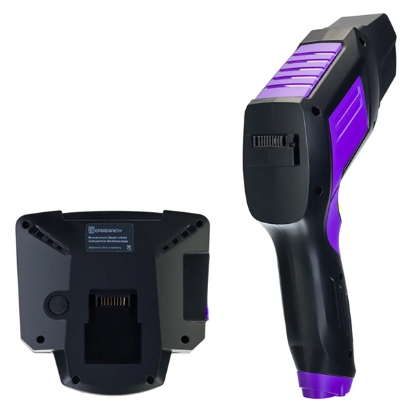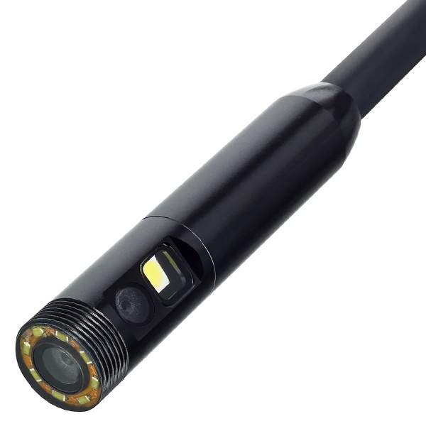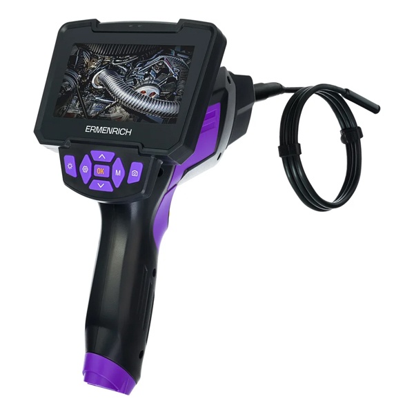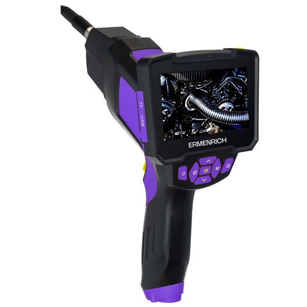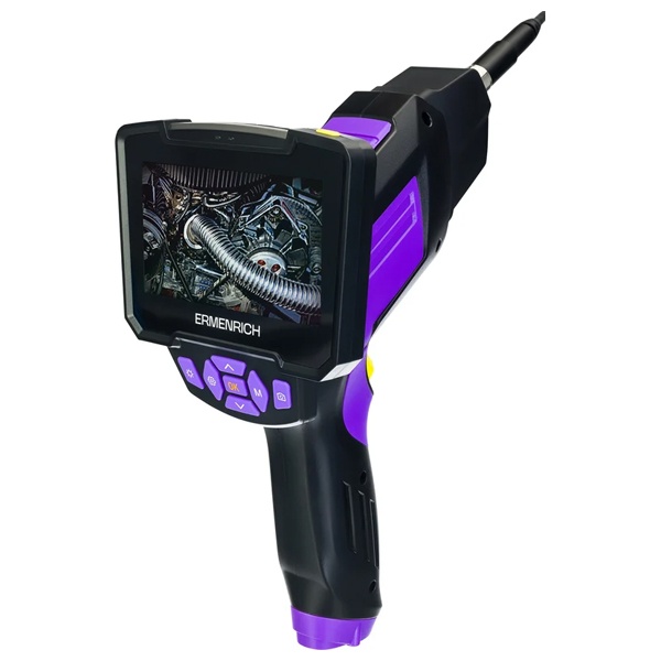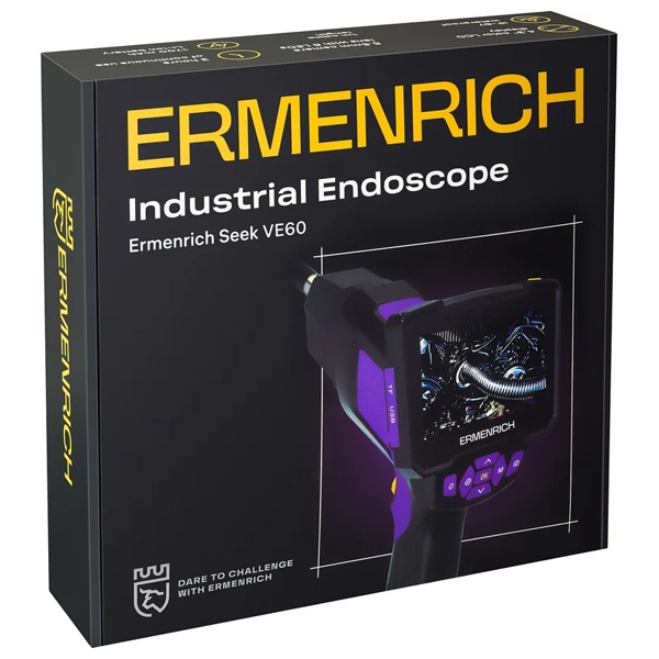 Технический эндоскоп Ermenrich Seek VE60 оснащён зондом с двумя камерами — фронтальной и боковой, каждая из которых обладает HD-разрешением и углом обзора 70°. Камеры оборудованы встроенными осветителями, что позволяет использовать зонд в условиях полной темноты. Полужёсткий кабель длиной 1 метр обеспечивает удобное проникновение в труднодоступные и малогабаритные конструкции, механизмы, контейнеры и другие объекты, сохраняя при этом стабильность и управляемость зонда.