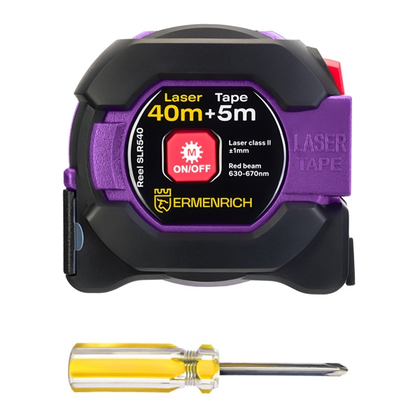 Ermenrich Reel SLR540 совмещает в себе ленточную рулетку и лазерную, что пригодится в множестве работ, требующих точных замеров. Рабочая дальность красного лазера достигает 40 м, минимальное расстояние до предмета – от 20 см. При этом погрешность луча не превышает 3 миллиметров.