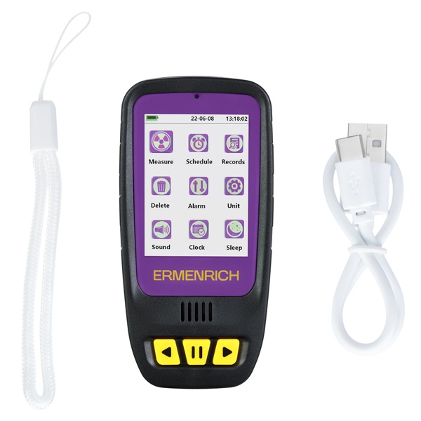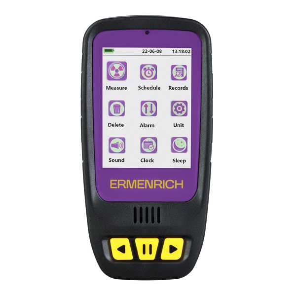 Дозиметр Ermenrich Ping RD40 – компактное устройство для замеров уровня бета-, гамма-, рентгеновского излучения на улице и в помещениях. Встроенный счетчик Гейгера-Мюллера определяет радиационный фон в пределах от 0,08 мкЗв до 50 мЗв, показывая результаты на 2-дюймовом цветном TFT-дисплее в виде значений текущей, средней и суммарной дозы (можно выбрать единицы измерения: микрогреи или микрозиверты). Управление прибором осуществляется 3 кнопками, меню интуитивно простое.