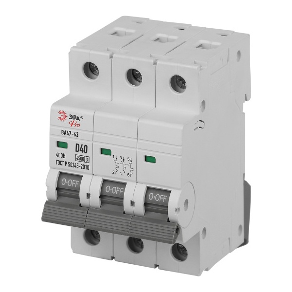 Электрический 3-полюсный автомат ВА47-63 40 Ампер характеристика D отключающая способность 4500А Б0059481 Автоматические выключатели серии ВА47-63 являются универсальными защитными устройствами, широко применяемыми как в бытовых, так и в промышленных электроустановках. Их основное назначение заключается в обеспечении надежной защиты электрических цепей и подключенного оборудования от перегрузок и токов короткого замыкания. Благодаря этому предотвращается повреждение проводки, продлевается срок службы электрооборудования и существенно снижается риск возникновения аварийных ситуаций, включая перегрев и возгорание.