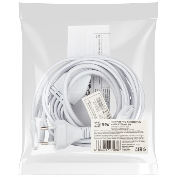 Изделие изготовлено из качественных изоляционных и токопроводящих материалов, полностью соответствующих требованиям электробезопасности. Конструкция выполнена по стандарту IEC 60320 C7 и подходит для оборудования II класса, не требующего заземления. Кабель типа ПВС 2х0,5 мм2 отличается гибкостью, прочностью и устойчивостью к многократным изгибам.