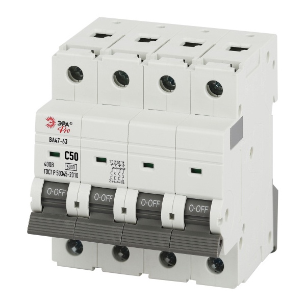 Четырехполюсный электрический автомат ЭРА ВА47-63 50 Ампер, уставка C Б0063188 Автоматический выключатель - это контактный коммутационный аппарат, предназначенный для включения, проведения и отключения электрического тока в нормальных режимах работы цепи, а также для автоматического отключения тока при возникновении аварийных или ненормальных условий, таких как перегрузки и токи короткого замыкания. Он способен пропускать ток в течение заданного времени и обеспечивает защиту электрической сети и подключённого оборудования от повреждений.
