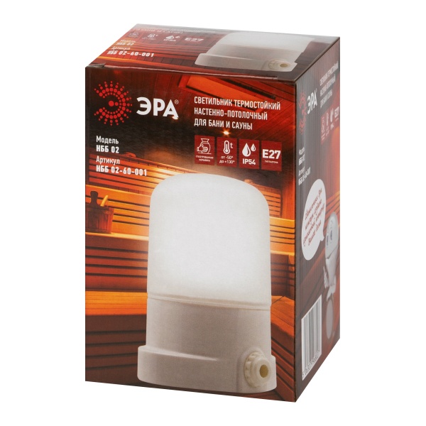 Термостойкий, влагозащищенный светильник для бани и сауны, под лампу с цоколем E27 максимальной мощностью 60 Ватт Б0064005 Термостойкий керамический светильник серии НББ-02 от ЭРА предназначен для эксплуатации в помещениях с повышенной температурой и влажностью. Он оптимально подходит для бань, саун, бассейнов, а также других зон, где требуется надёжное и безопасное освещение при сложных условиях эксплуатации.