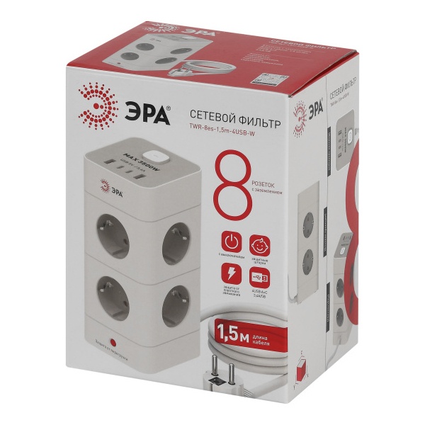 Сетевой фильтр Эра TWR - это практичное решение для организации питания техники с акцентом на безопасность, функциональность и современный дизайн.