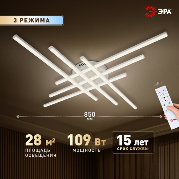 Светодиодная потолочная люстра ЭРА Модерн Nora 109Вт с регулируемой температурой цвета и дистанционным управлением Б0069760 Серия потолочных светодиодных светильников в универсальном белом цвете - это стильное и практичное решение для современных жилых и коммерческих интерьеров. Лаконичный дизайн гармонично вписывается в любой стиль - от минимализма и скандинавского до классики и хай-тек.