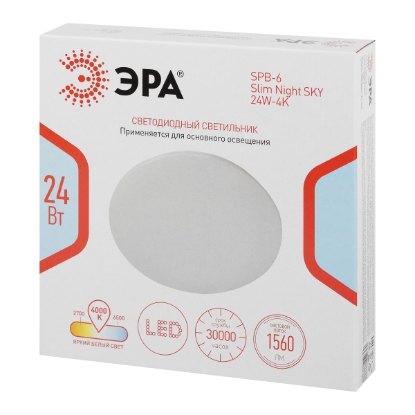 Круглый накладной LED светильник ЭРА SPB-6 "Night Sky", мощностью 24 Вт нейтральный белый свет, цвет белый Б0069780 Светодиодный светильник ЭРА SPB-6 - это современное и практичное решение для организации общего освещения в жилых и коммерческих помещениях. Благодаря компактным размерам модель отлично подходит для установки в комнатах с низкими потолками, не перегружая пространство и сохраняя ощущение легкости в интерьере. Степень защиты IP20 позволяет безопасно использовать светильник в сухих помещениях - гостиных, спальнях, коридорах, офисах, торговых залах и подсобных комнатах.