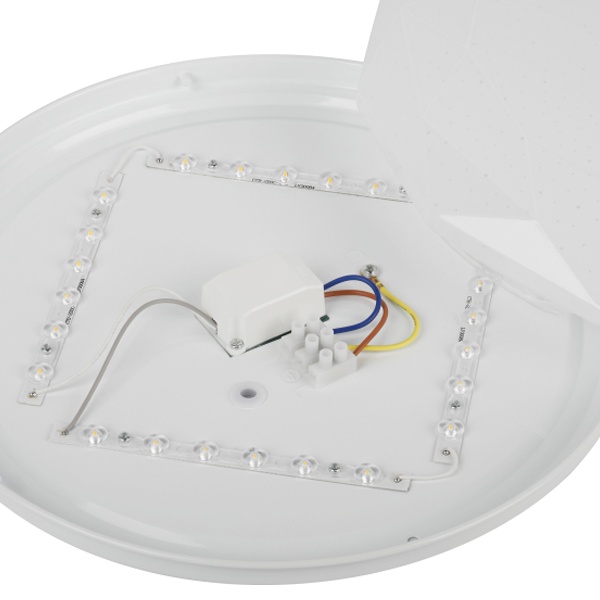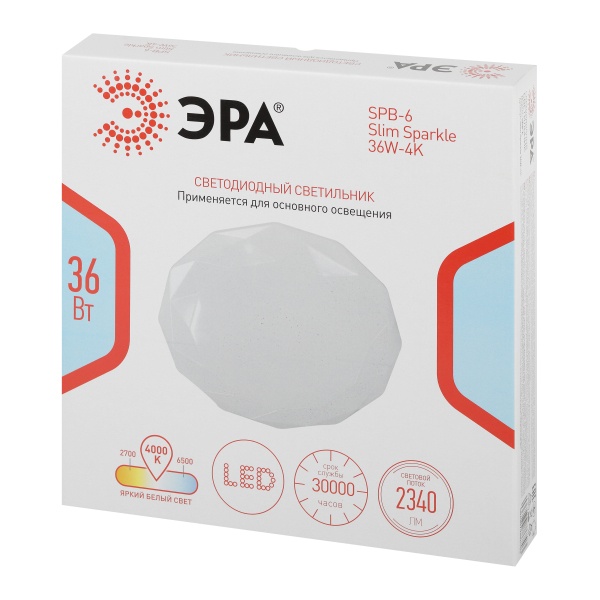 LED светильник тарелка накладного потолочного монтажа 36 Вт нейтральный белый свет Б0069789 Светодиодный светильник ЭРА SPB-6 Slim Sparkle — современный вариант для организации общего освещения в жилых и коммерческих помещениях. Благодаря компактным размерам 330x55 мм модель отлично подходит для комнат с невысокими потолками. Степень защиты IP20 позволяет использовать светильник в сухих внутренних пространствах, а оригинальная форма плафона гармонично сочетается с различными стилями интерьера.Мощность устройства составляет 36 Вт, при этом световой поток достигает 2340 лм, обеспечивая достаточную яркость для повседневного освещения. Матовый рассеиватель способствует мягкому и равномерному распределению света без бликов и зрительного дискомфорта.Нейтральная цветовая температура 4000 К создаёт комфортную атмосферу как для работы, так и для отдыха. Светильник эффективно освещает площадь до 9 м2 . Встроенные светодиоды отличаются экономичным энергопотреблением, стабильной работой без мерцания и длительным сроком службы — до 30 000 часов.Модель проста в установке, не требует дополнительного обслуживания и подходит для использования в качестве основного или дополнительного источника света. ЭРА SPB-6 Slim Sparkle объединяет современный дизайн, надёжность и энергоэффективность, что делает его практичным выбором для квартир, офисов, торговых и подсобных помещений.