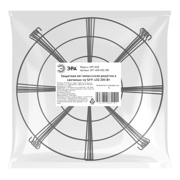Антивандальная стальная решетка SPP-AC8 для подвесных светильников SPP-402 200Вт Б0069978 Защитная металлическая решётка ЭРА SPP-AC8 предназначена для дополнительной защиты промышленных и складских светильников SPP-402 мощностью 200 W. Аксессуар предотвращает повреждение светильника от механических воздействий - ударов, падения предметов или случайного контакта, что особенно важно в производственных, складских и технических помещениях.