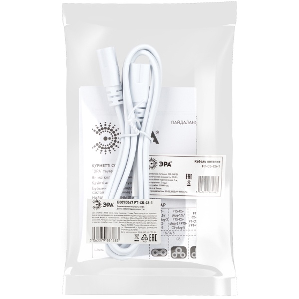 Кабель соединительный для линейных светильников ЭРА Cable FT. Данный соединительный кабель предназначен для подключения линейных светильников к электрической сети и увеличения расстояния между светильником и источником питания. Оснащён разъёмом 3-pin мама–папа, совместим с большинством современных линейных LED-светильников ЭРА и аналогичных моделей других брендов.