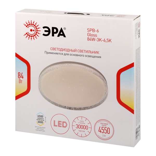 Круглый накладной LED светильник ЭРА SPB-6 "Gloss", мощностью 84 Вт изменяемая температура света, цвет белый Б0070196 Светодиодный светильник ЭРА SPB-6 - это современное и практичное решение для организации общего освещения в жилых и коммерческих помещениях. Благодаря компактным размерам модель отлично подходит для установки в комнатах с низкими потолками, не перегружая пространство и сохраняя ощущение легкости в интерьере. Степень защиты IP20 позволяет безопасно использовать светильник в сухих помещениях - гостиных, спальнях, коридорах, офисах, торговых залах и подсобных комнатах.