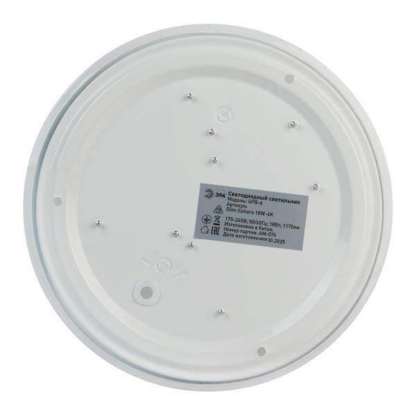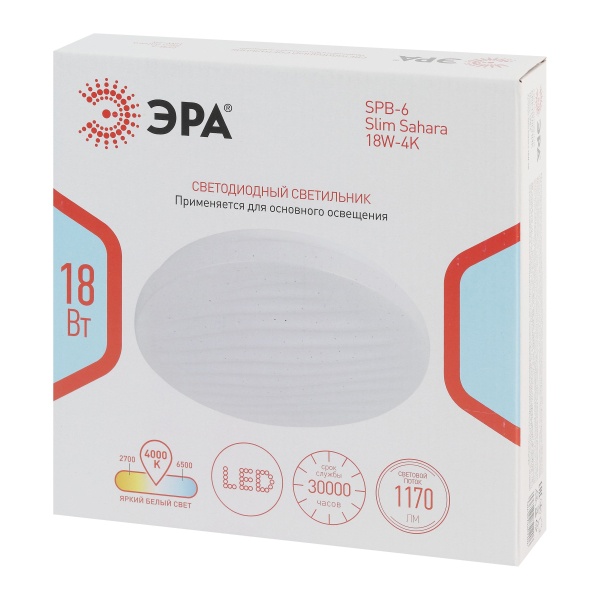 LED светильник тарелка накладного потолочного монтажа 18 Вт нейтральный белый свет Б0071123 Светодиодный светильник ЭРА SPB-6 Slim Sahara — стильное и практичное решение для освещения жилых и коммерческих пространств. Компактный корпус размером 210x50 мм позволяет устанавливать модель даже в помещениях с невысокими потолками. Степень защиты IP20 предусматривает использование в сухих внутренних зонах.Рельефный плафон с эффектом «звёздного неба» придаёт светильнику выразительность и создаёт мягкую декоративную игру света, гармонично дополняя различные интерьерные стили. При мощности 18 Вт устройство формирует световой поток 1170 лм, обеспечивая достаточную яркость для повседневных задач. Матовый рассеиватель способствует равномерному распределению света без бликов и нагрузки на глаза.Цветовая температура 4000K создаёт комфортное нейтрально-белое освещение, подходящее как для работы, так и для отдыха. Светильник эффективно освещает площадь до 6 м2 . Встроенные светодиоды отличаются экономичным энергопотреблением, стабильной работой без мерцания и длительным сроком службы — до 30 000 часов.Модель проста в установке, не требует дополнительного обслуживания и может использоваться в качестве основного либо дополнительного источника света. ЭРА SPB-6 Slim Sahara сочетает современный дизайн, надёжность и энергоэффективность, делая её универсальным выбором для квартир, офисов, торговых и подсобных помещений.