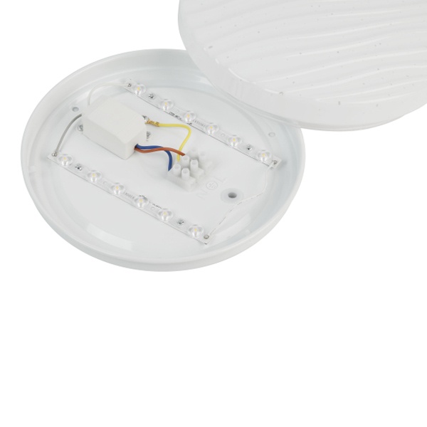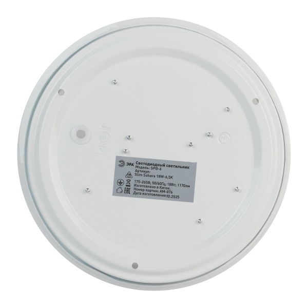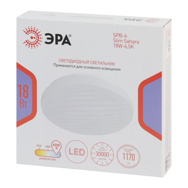 LED светильник тарелка накладного потолочного монтажа 18 Вт холодный дневной свет Б0071124 Светодиодный светильник ЭРА SPB-6 Slim Sahara — стильное и практичное решение для освещения жилых и коммерческих пространств. Компактный корпус размером 210x50 мм позволяет устанавливать модель даже в помещениях с невысокими потолками. Степень защиты IP20 предусматривает использование в сухих внутренних зонах.Рельефный плафон с эффектом «звёздного неба» придаёт светильнику выразительность и создаёт мягкую декоративную игру света, гармонично дополняя различные интерьерные стили. При мощности 18 Вт устройство формирует световой поток 1170 лм, обеспечивая достаточную яркость для повседневных задач. Матовый рассеиватель способствует равномерному распределению света без бликов и нагрузки на глаза.Цветовая температура 6500K создаёт комфортное нейтрально-белое освещение, подходящее как для работы, так и для отдыха. Светильник эффективно освещает площадь до 6 м2 . Встроенные светодиоды отличаются экономичным энергопотреблением, стабильной работой без мерцания и длительным сроком службы — до 30 000 часов.Модель проста в установке, не требует дополнительного обслуживания и может использоваться в качестве основного либо дополнительного источника света. ЭРА SPB-6 Slim Sahara сочетает современный дизайн, надёжность и энергоэффективность, делая её универсальным выбором для квартир, офисов, торговых и подсобных помещений.