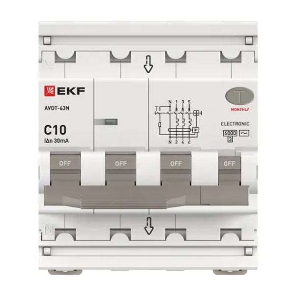 • Дифавтомат EKF PROxima АВДТ-63N 3P+N 10А 30мА характеристика C тип АС трехфазный электронный 6кА (дифференциальный автомат, АВДТ)