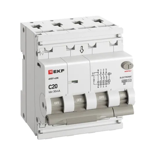 • Дифавтомат EKF PROxima АВДТ-63N 3P+N 20А 30мА характеристика C тип АС трехфазный электронный 6кА (дифференциальный автомат, АВДТ)