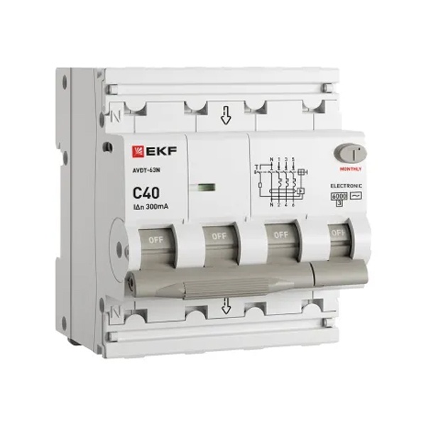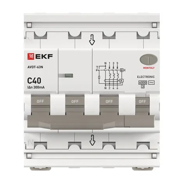 • Дифавтомат EKF PROxima АВДТ-63N 3P+N 40А 300мА характеристика C тип АС трехфазный электронный 6кА (дифференциальный автомат, АВДТ)
