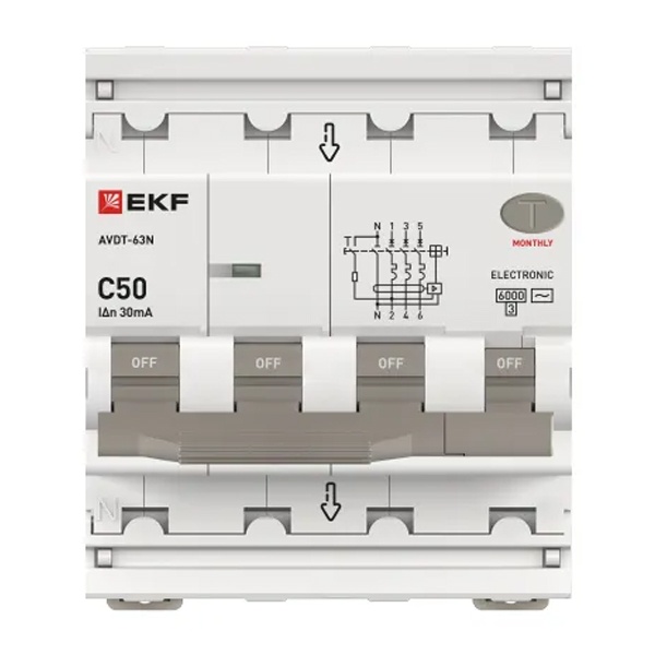 • Дифавтомат EKF PROxima АВДТ-63N 3P+N 50А 30мА характеристика C тип АС трехфазный электронный 6кА (дифференциальный автомат, АВДТ)