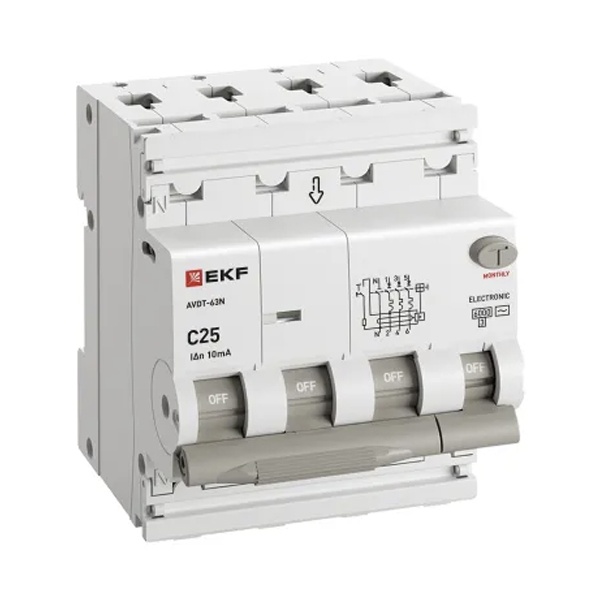 Дифавтомат EKF PROxima АВДТ-63N 3P+N 25А 10мА характеристика C тип А трехфазный электронный 6кА (дифференциальный автомат, АВДТ)