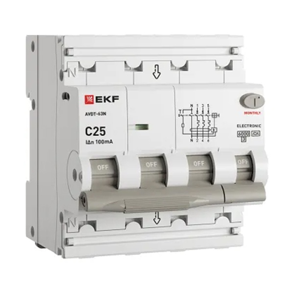 • Дифавтомат EKF PROxima АВДТ-63N 3P+N 25А 100мА характеристика C тип А трехфазный электронный 6кА (дифференциальный автомат, АВДТ)