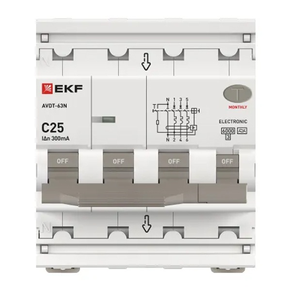 • Дифавтомат EKF PROxima АВДТ-63N 3P+N 25А 300мА характеристика C тип А трехфазный электронный 6кА (дифференциальный автомат, АВДТ)