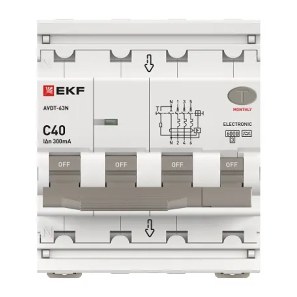• Дифавтомат EKF PROxima АВДТ-63N 3P+N 40А 300мА характеристика C тип А трехфазный электронный 6кА (дифференциальный автомат, АВДТ)