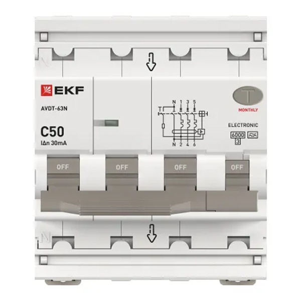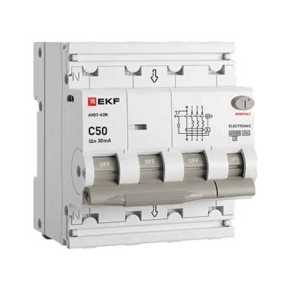 • Дифавтомат EKF PROxima АВДТ-63N 3P+N 50А 30мА характеристика C тип А трехфазный электронный 6кА (дифференциальный автомат, АВДТ)