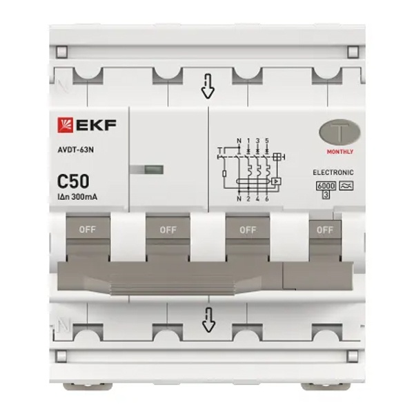 • Дифавтомат EKF PROxima АВДТ-63N 3P+N 50А 300мА характеристика C тип А трехфазный электронный 6кА (дифференциальный автомат, АВДТ)
