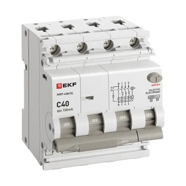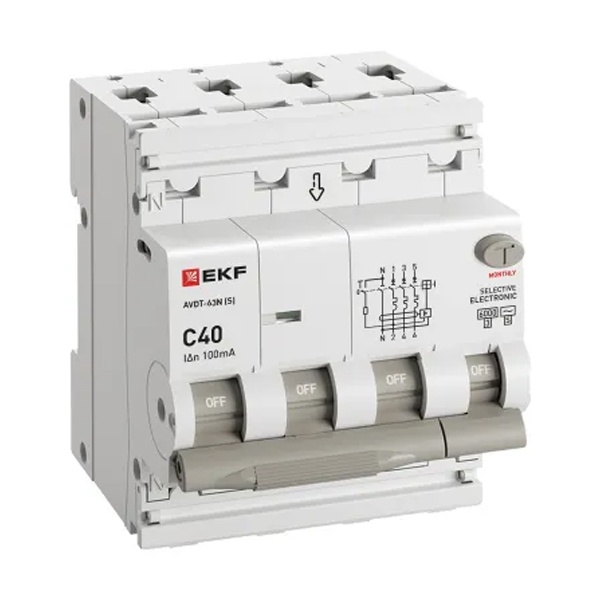 • Дифавтомат EKF PROxima АВДТ-63N (S) 3P+N C40А 100мА тип АС трехфазный селективный электронный 6кА (дифференциальный автомат, АВДТ)