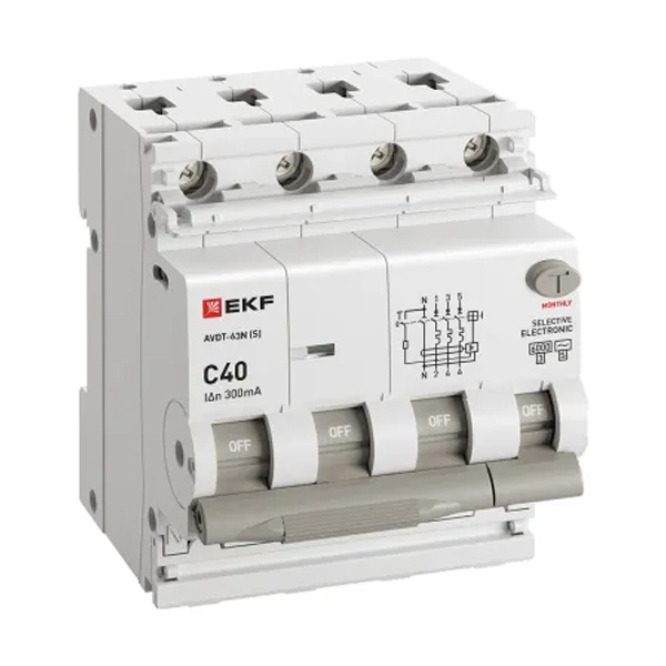 • Дифавтомат EKF PROxima АВДТ-63N (S) 3P+N C40А 300мА тип АС трехфазный селективный электронный 6кА (дифференциальный автомат, АВДТ)