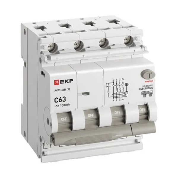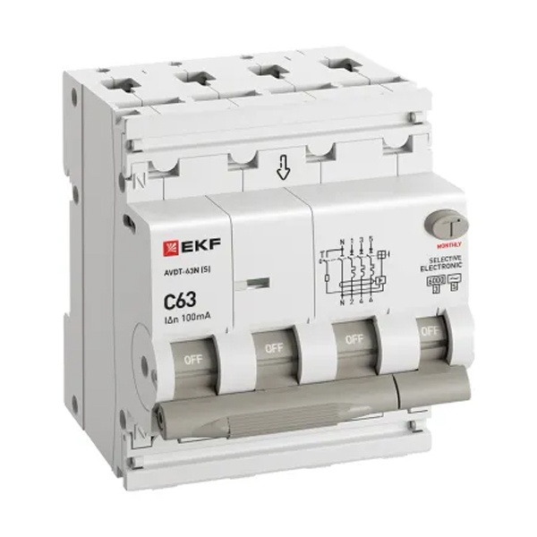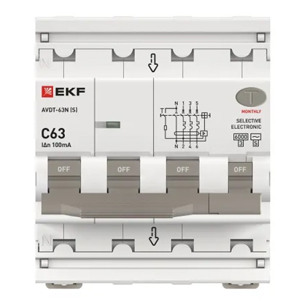 • Дифавтомат EKF PROxima АВДТ-63N (S) 3P+N C63А 100мА тип АС трехфазный селективный электронный 6кА (дифференциальный автомат, АВДТ)