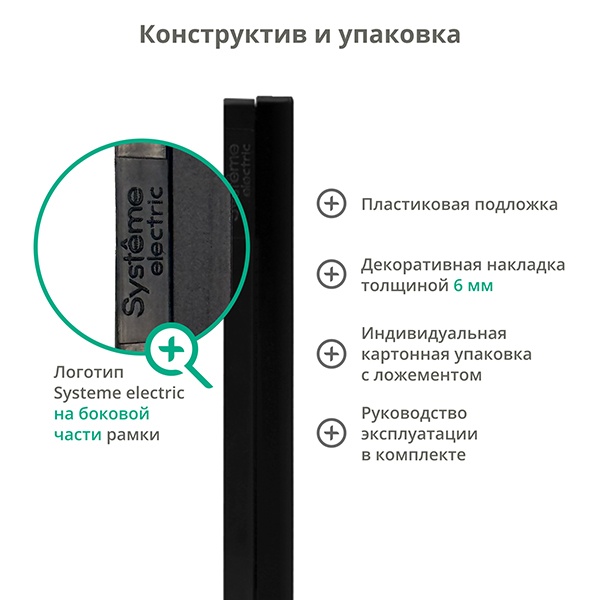 Рамка Systeme Electric серии ArtGallery Pure изготовлена из высококачественного органического стекла в насыщенном чёрном цвете. Глянцевая поверхность «чёрного стекла» создаёт эффект глубокого зеркального блеска, усиливает контраст и придаёт интерьеру выразительную современную графичность.
