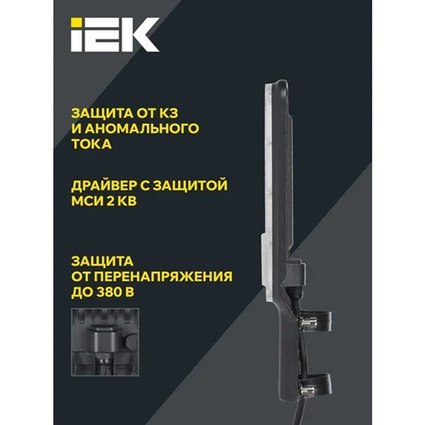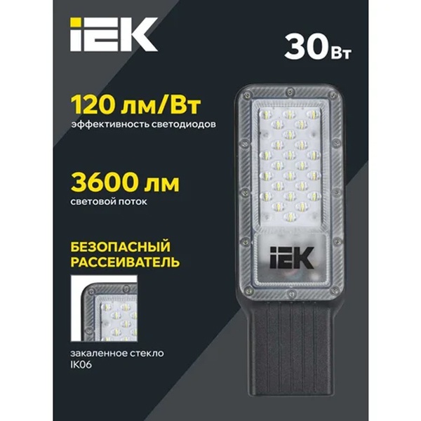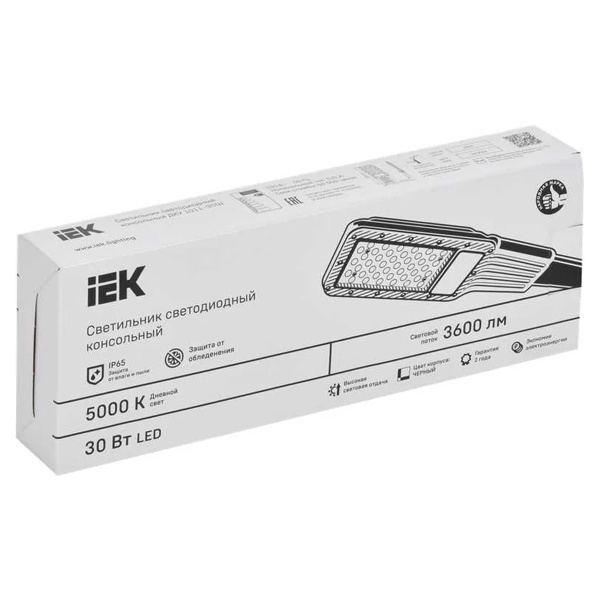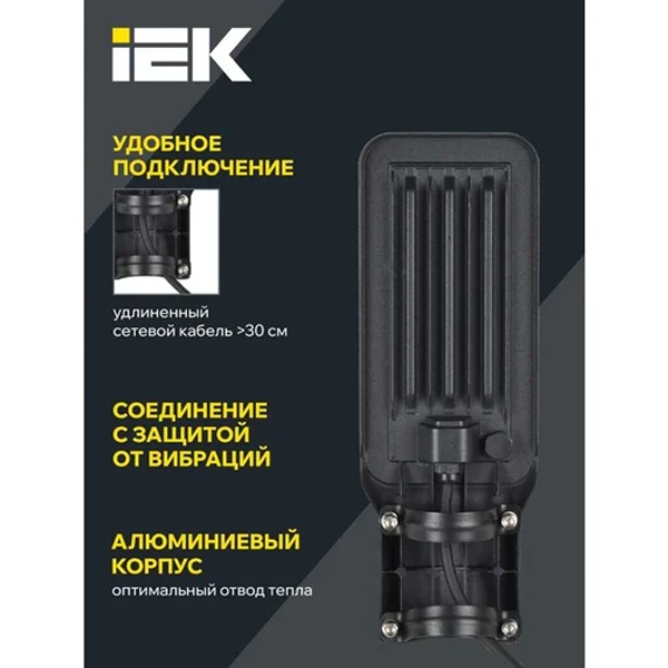 Черный влагозащищенный алюминиевый светодидный светильник ИЕК ДКУ-1011 на консольный кронштейн 50 мм, мощностью 30 Ватт, белый свет КСС Ш LT-DKU1-1011-030-50-K03Светильники предназначены для эффективного и экономичного освещения улиц и дорог, парковых аллей, пешеходных зон, железнодорожных платформ, промышленных территорий и других протяжённых объектов. Благодаря широкой кривой светораспределения обеспечивается равномерная засветка дорожного полотна и прилегающих зон без образования «слепых пятен». Высококачественная вторичная оптика не только повышает эффективность светового потока, но и предотвращает ослепление пешеходов и водителей. Корпус выполнен из литого алюминиевого сплава, обладающего высокой прочностью, устойчивостью к коррозии и эффективным теплоотводом, что продлевает срок службы светильника. Вторичная оптика изготовлена из UV-устойчивого, ударопрочного поликарбоната, сохраняющего прозрачность и форму даже при длительной эксплуатации. Характеристики:- Материал корпуса: Алюминий