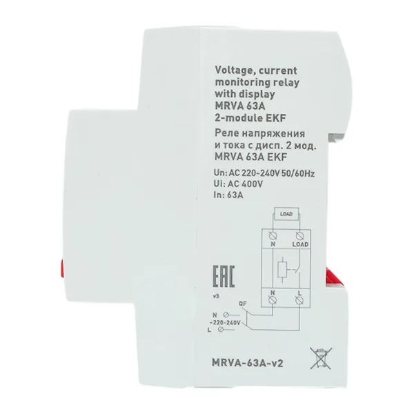 Реле контроля тока и напряжения в однофазной сети ЭКФ PROxima, коммутируемый ток 63 Ампера MRVA-63A-v2 Реле напряжения и тока предназначены для непрерывного мониторинга параметров электрической сети и надежной защиты оборудования от неблагоприятных факторов - таких как перепады напряжения, перегрузки и резкие скачки тока. Эти устройства широко применяются как в однофазных, так и в трехфазных сетях, обеспечивая стабильную и безопасную работу бытовой и промышленной техники.