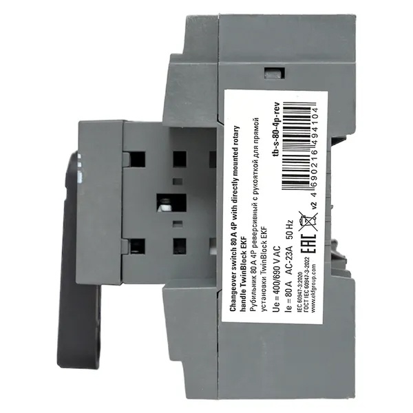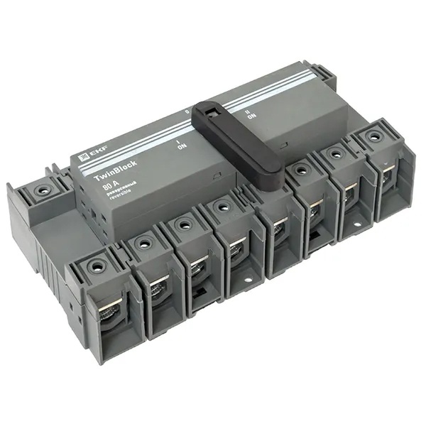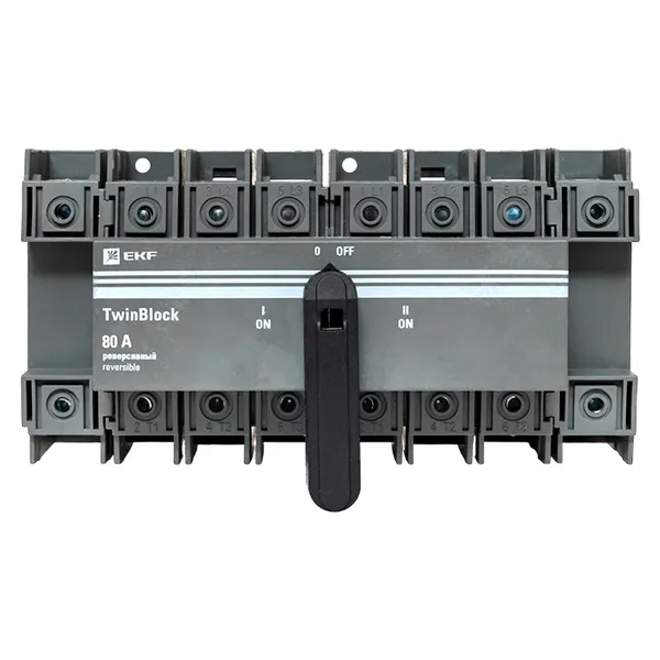 Четырехполюсный выключатель-разъединитель реверсивный (перекидной) ЭКФ TwinBlock c рукояткой управления, номинальный ток 80 Ампер tb-s-80-4p-rev Выключатели-разъединители серии TwinBlock EKF PROxima предназначены для пропускания номинальных токов, включения и отключения электрических цепей номинальным напряжением до 690 В переменного тока частотой 50 и 60 Гц в устройствах распределения электрической энергии.