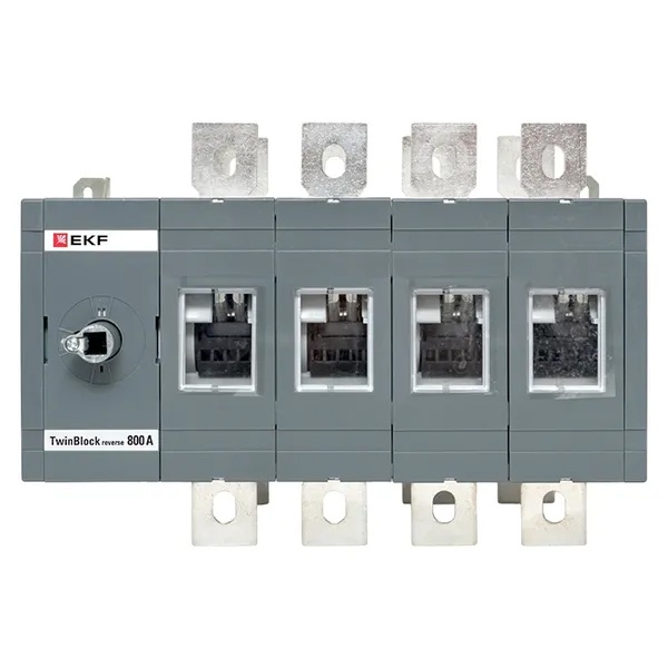 Четырехполюсный выключатель-разъединитель ЭКФ TwinBlock реверсивный (перекидной) без рукоятки управления, номинальный ток 800 Ампер tb-s-800-4p-rev Выключатели-разъединители серии TwinBlock EKF PROxima предназначены для пропускания номинальных токов, включения и отключения электрических цепей номинальным напряжением до 690 В переменного тока частотой 50 и 60 Гц в устройствах распределения электрической энергии.