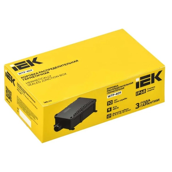 Коробка выполнена в герметичном исполнении с классом защиты IP68, что обеспечивает полную пыленепроницаемость и устойчивость к длительному воздействию влаги. Подходит для монтажа на открытых поверхностях.