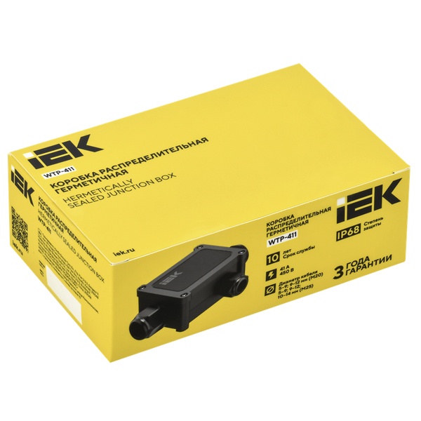 Коробка выполнена в герметичном исполнении с классом защиты IP68, что обеспечивает полную пыленепроницаемость и устойчивость к длительному воздействию влаги. Подходит для монтажа на открытых поверхностях.